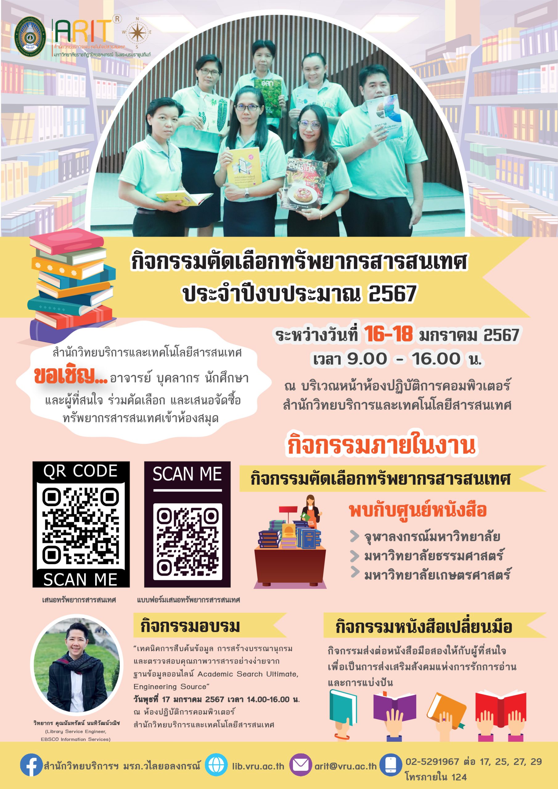 สำนักวิทยบริการฯ ขอเชิญ…อาจารย์ บุคลากร นักศึกษา และผู้ที่สนใจร่วมคัดเลือก และเสนอจัดซื้อทรัพยากรสารสนเทศเข้าห้องสมุด ระหว่างวันที่ 16-18 มกราคม 2567 เวลา 9.00 – 16.00 น. ณ บริเวณหน้าห้องปฏิบัติการคอมพิวเตอร์ สำนักวิทยบริการและเทคโนโลยีสารสนเทศ กิจกรรมภายในงาน มีดังนี้ กิจกรรมคัดเลือกทรัพยากรสารสนเทศ พบกับศูนย์หนังสือ จุฬาลงกรณ์มหาวิทยาลัย มหาวิทยาลัยธรรมศาสตร์ มหาวิทยาลัยเกษตรศาสตร์ กิจกรรมอบรม “เทคนิคการสืบค้นข้อมูลการสร้างบรรณานุกรมและตรวจสอบคุณภาพวารสารอย่างง่ายจากฐานข้อมูลออนไลน์Academic Search Ultimate,Engineering Source”วิทยากร คุณนันทรัตน์ นนทิวัฒน์วณิช (Library Service Engineer,EBSCO Information Services)ในวันพุธที่ 17 มกราคม 2567 เวลา 14.00-16.00 น. ณ ห้องปฏิบัติการคอมพิวเตอร์ กิจกรรมหนังสือเปลี่ยนมือ กิจกรรมส่งต่อหนังสือมือสองให้กับผู้ที่สนใจเพื่อเป็นการส่งเสริมสังคมแห่งการรักการอ่าน และการแบ่งปัน