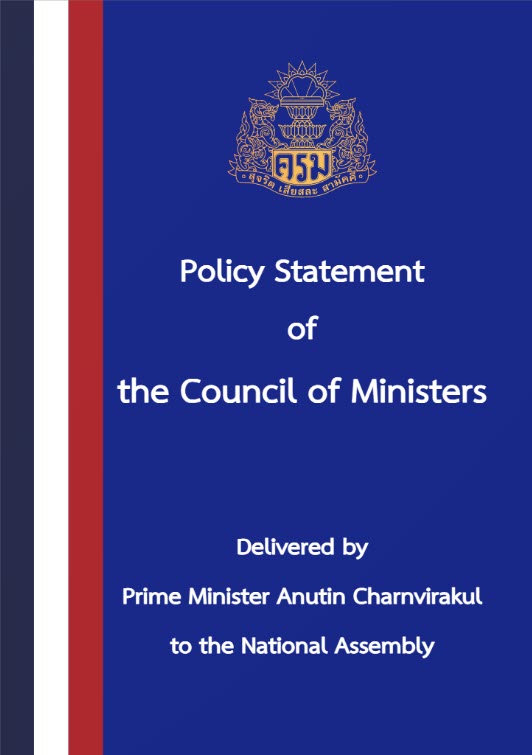 ประชาสัมพันธ์คำแถลงนโยบาย ของ คณะรัฐมนตรี (ฉบับภาษาอังกฤษ)16/10/2025วรุตม์ ช้างเถื่อนข่าวประชาสัมพันธ์อื่นๆ สำนักเลขาธิการคณะรัฐมนตรี ขอส่งคำแถลงนโยบาย ของ คณะรัฐมนตรี นายอนุทิน ชาญวีรกูล นายกรัฐมนตรี แถลงต่อรัฐสภา วันจันทร์ที่ ๒๙ กันยายน ๒๕๖๘ (ฉบับภาษาอังกฤษ) เพื่อเผยแพร่และใช้ประโยชน์ ในรูปแบบ e-book